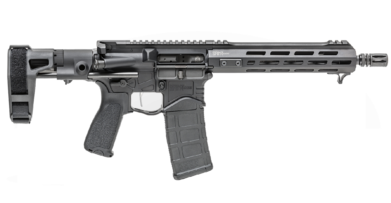 This springfield saint edge 5.56mm semi-automatic pistol also includes a BCM Gunfighter charging handle, a nickel boron coated bolt carrier group for enhanced lubricity, and a single-stage trigger with a safety selector. It ships with one 30-round magazine and a soft carrying case.