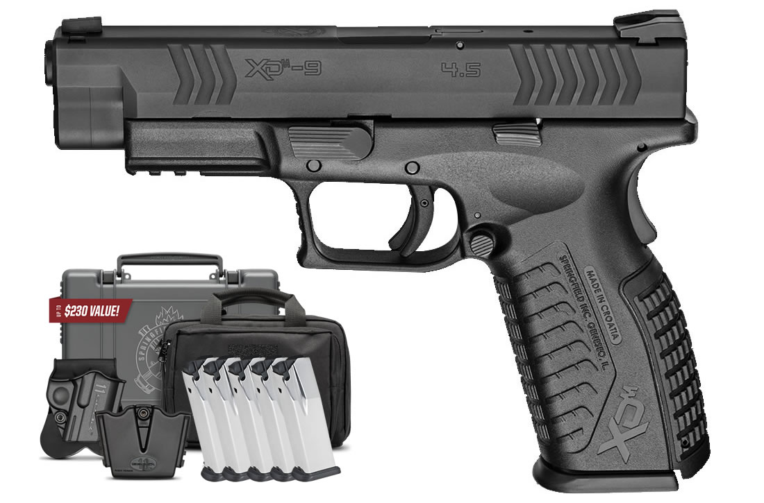 - Package contents: One Springfield XDM 9mm 4.5 Full-Size pistol, five 16-round magazines, padded double-magazine range bag, and ambidextrous paddle holster